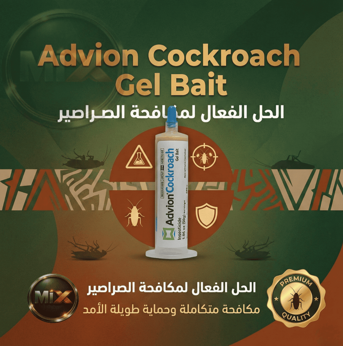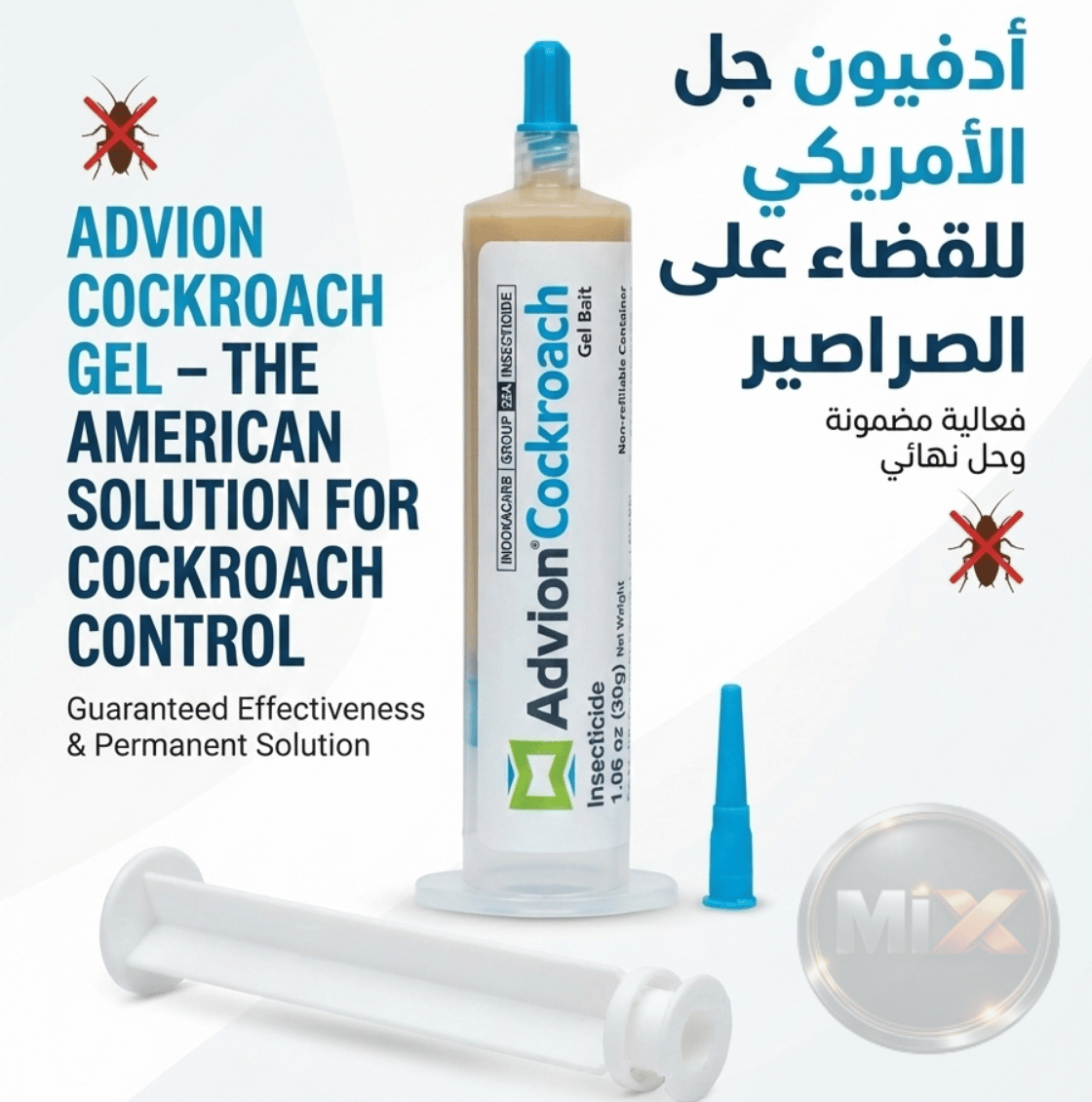أدفيون جل الأمريكي لمكافحة الصراصير (Advion Cockroach Gel) المادة الفعالة: إندوكساكارب (Indoxacarb) بنسبة 0.6% بلد المنشأ: الولايات المتحدة الأمريكية (Syngenta)